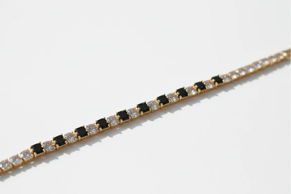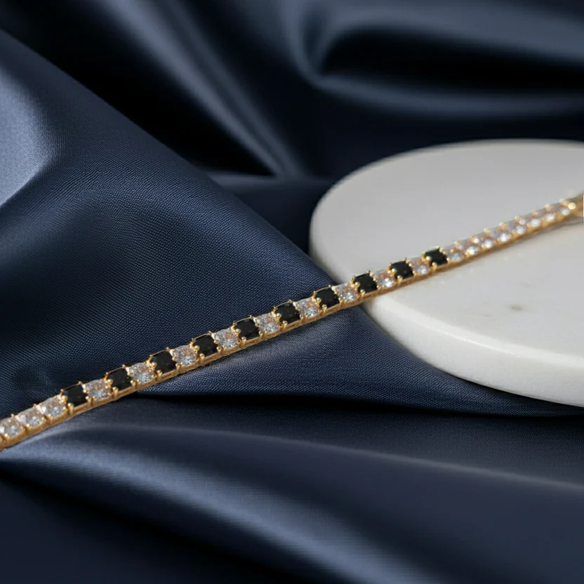 The Black & Gold Crystal Tennis Bracelet is the perfect fusion of bold contrast and timeless charm. Featuring alternating black and clear zircon stones set in a delicate gold-plated chain, this bracelet adds a touch of sophistication to any look. Its sleek design makes it ideal for both casual and formal wear. Lightweight yet luxurious, it’s a statement piece that reflects confidence, grace, and effortless elegance.