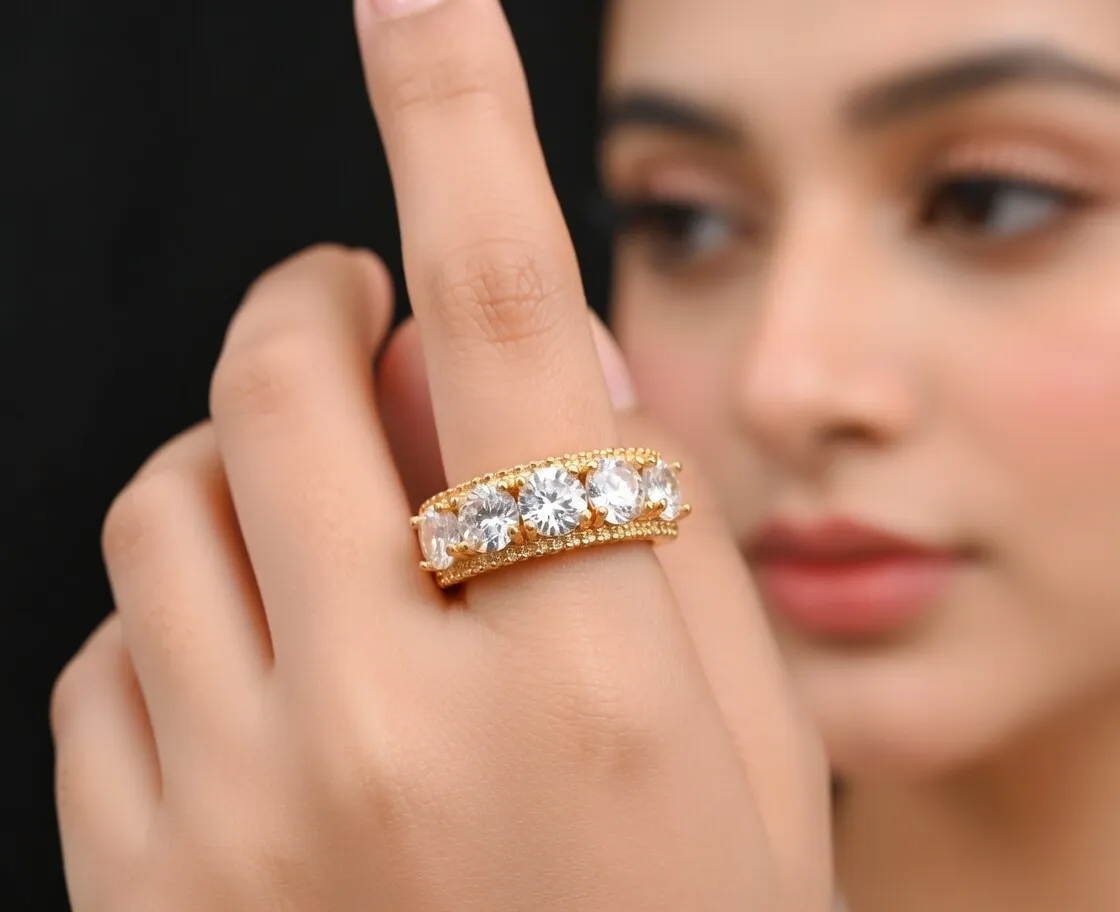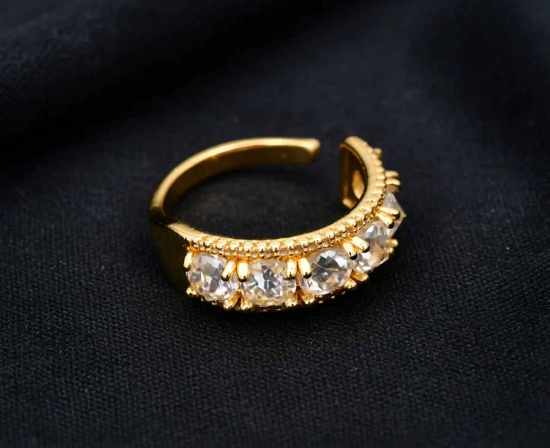 It’s a classic open-band design in rich gold plating with a neat row of clear sparkling stones right on the front. The stones catch the light beautifully and give it that subtle bling, while the open back makes it fully adjustable so it fits almost any toe or finger perfectly. No more worrying about size — just slide it on and go.