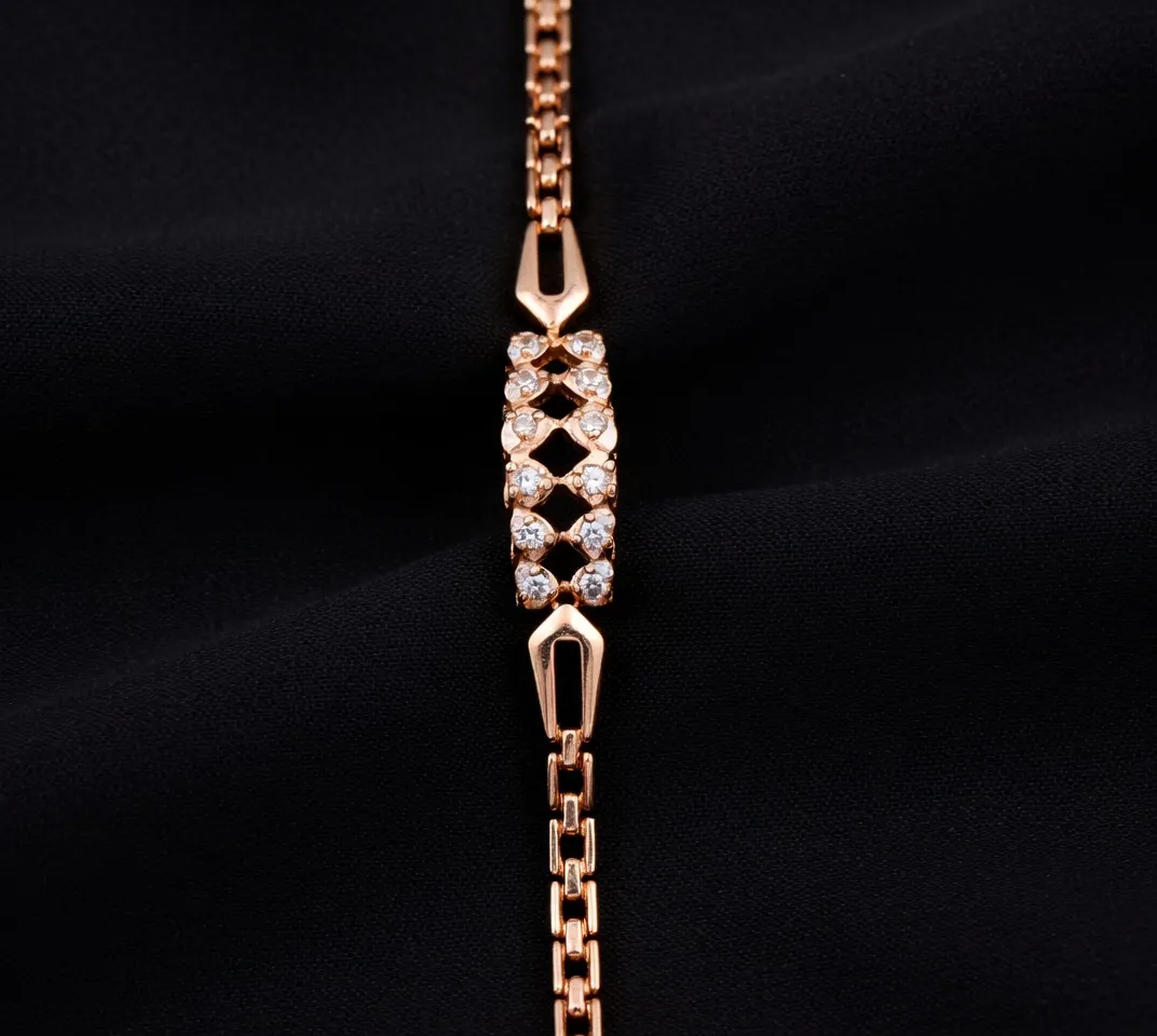 It’s a sleek rose-gold chain with that beautiful box-link style, and right in the center there’s a stunning rectangular panel covered in tiny sparkling stones arranged in a pretty geometric pattern. The pointed details at the top and bottom of the panel give it a classy, finished look that catches the light beautifully. It’s delicate enough for daily wear yet has enough sparkle to dress up any outfit.