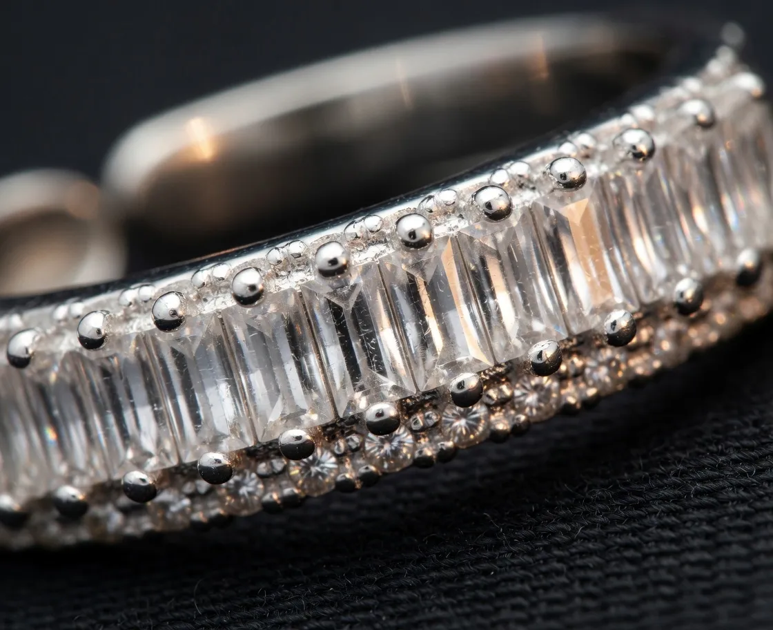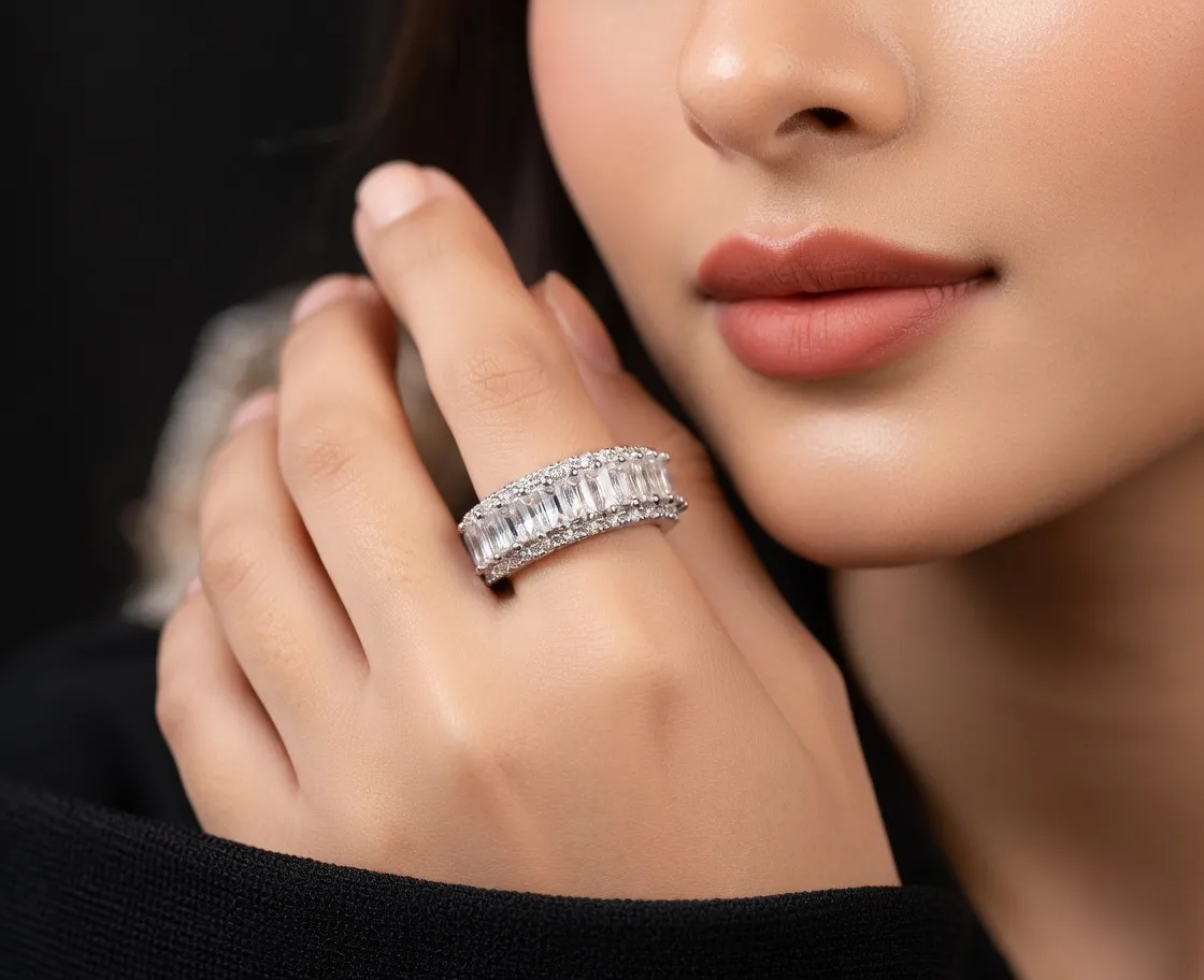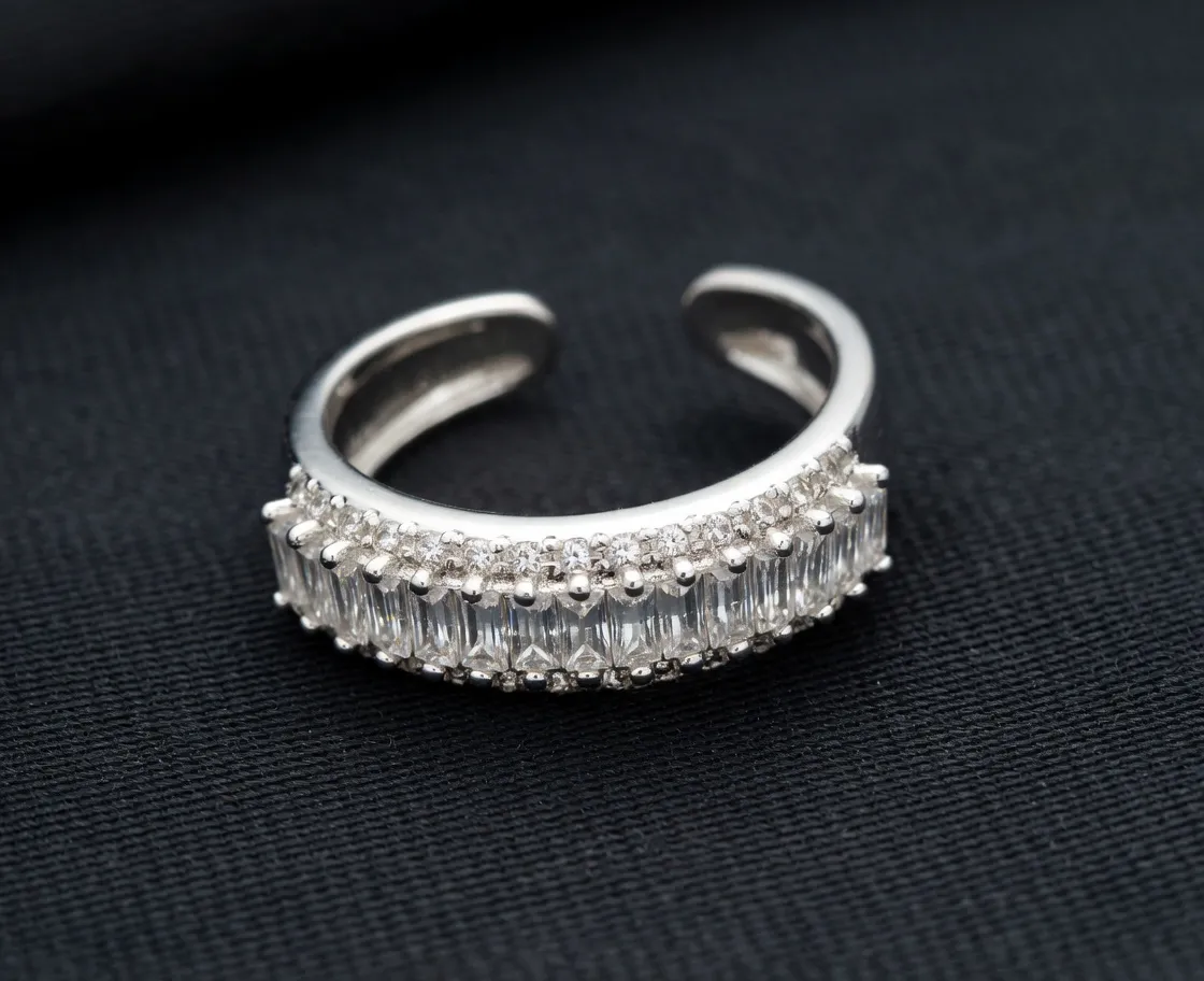 It’s got this sleek open-band design in a cool silver tone with a neat row of rectangular baguette stones that catch the light just right. The stones give it that clean, modern sparkle, and honestly, it looks way more expensive than it is. Plus, the open back makes it fully adjustable, so it fits almost any (or even a finger if you’re into that) without worrying about exact sizing. Just slide it on and you’re good to go.