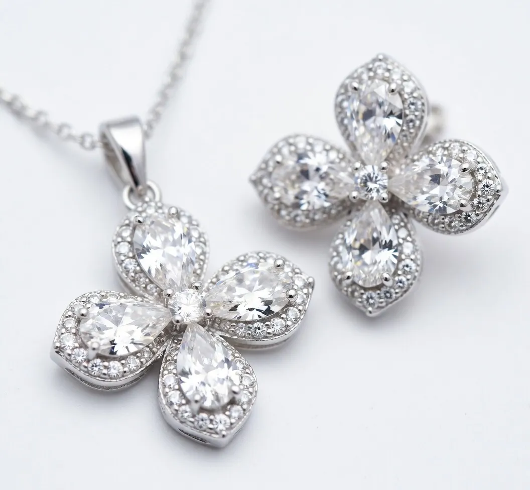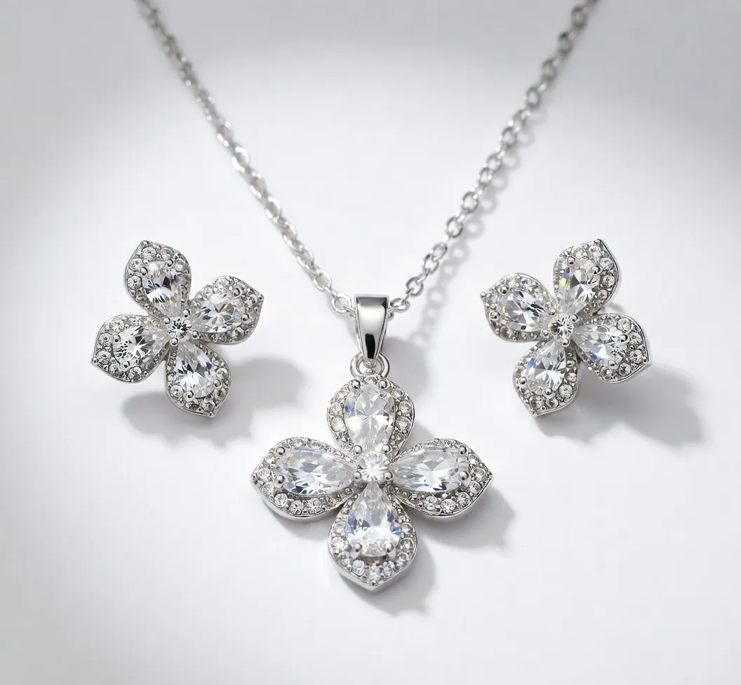 It’s a graceful silver chain with a beautiful four-petal flower pendant featuring a large sparkling teardrop stone right in the center, surrounded by smaller clear stones that catch the light beautifully. The matching flower earrings complete the set perfectly — same floral design, same sparkle. The whole look is elegant yet simple, so it works for daily wear or when you want to dress up a little.